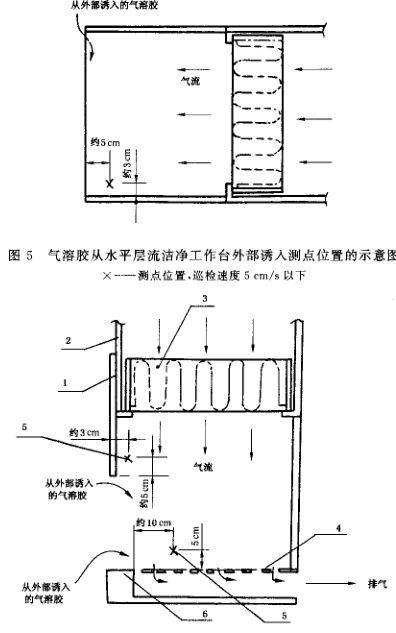 水平层流洁净工作台,应在距操作区壁面3c m,距接缝5c m 的下游处;而垂直层流洁净工作台,应