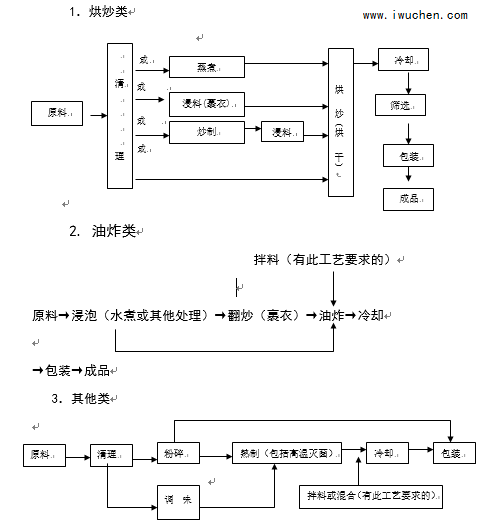 1.清理设备;2.熟制(灭菌)设备(蒸煮、烘炒、干燥、油炸等相应的设备);3.裹衣设备或粉碎设备或混合设备(有此类工艺要求的);4.包装设备(封口、生产日期标注、计量称重等设备)。